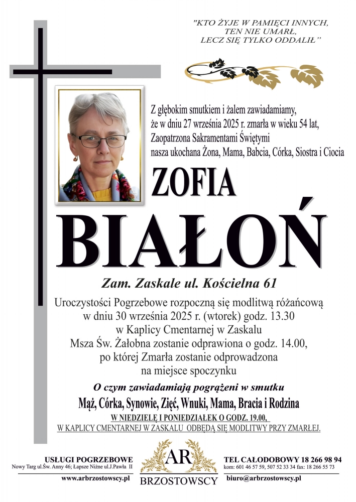 Podhale24.pl zastrzega sobie prawo do nie publikowania wspomnień, w szczególności tych nie związanych z profilem działu nekrologi, zawierających wulgaryzmy, wzywających do zachowań niezgodnych z prawem, obrażających osoby publiczne i prywatne, obrażających inne narodowości, rasy, religie itd, oraz te, bez możliwości telefonicznej lub mailowej weryfikacji ich autora.
