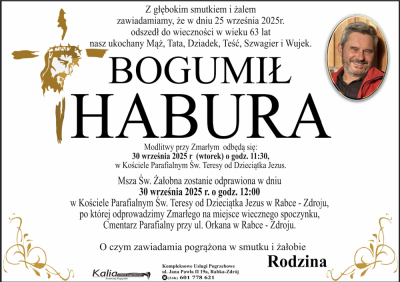 Podhale24.pl zastrzega sobie prawo do nie publikowania wspomnień, w szczególności tych nie związanych z profilem działu nekrologi, zawierających wulgaryzmy, wzywających do zachowań niezgodnych z prawem, obrażających osoby publiczne i prywatne, obrażających inne narodowości, rasy, religie itd, oraz te, bez możliwości telefonicznej lub mailowej weryfikacji ich autora.