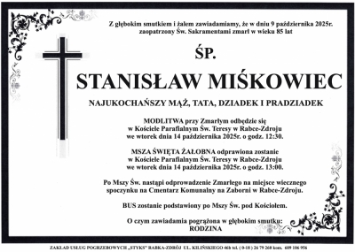 Podhale24.pl zastrzega sobie prawo do nie publikowania wspomnień, w szczególności tych nie związanych z profilem działu nekrologi, zawierających wulgaryzmy, wzywających do zachowań niezgodnych z prawem, obrażających osoby publiczne i prywatne, obrażających inne narodowości, rasy, religie itd, oraz te, bez możliwości telefonicznej lub mailowej weryfikacji ich autora.