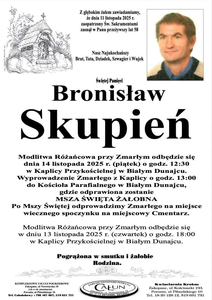 Podhale24.pl zastrzega sobie prawo do nie publikowania wspomnień, w szczególności tych nie związanych z profilem działu nekrologi, zawierających wulgaryzmy, wzywających do zachowań niezgodnych z prawem, obrażających osoby publiczne i prywatne, obrażających inne narodowości, rasy, religie itd, oraz te, bez możliwości telefonicznej lub mailowej weryfikacji ich autora.