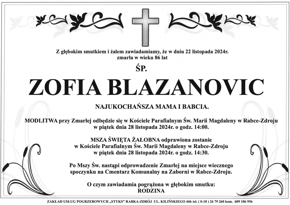 Zofia Blazanovic - Nekrologi - podhale24.pl