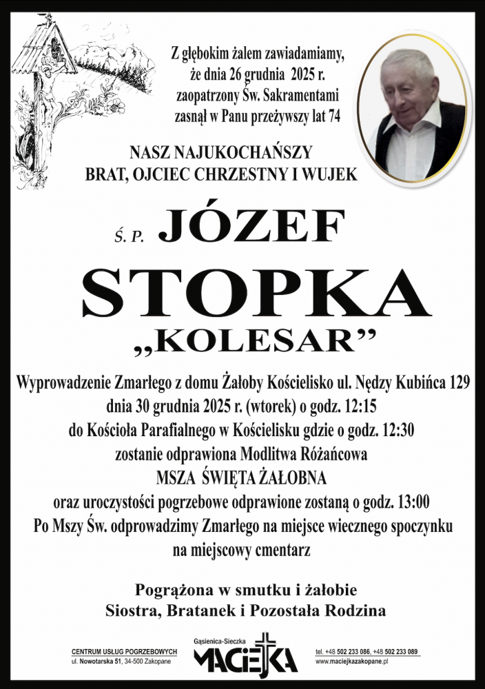 Podhale24.pl zastrzega sobie prawo do nie publikowania wspomnień, w szczególności tych nie związanych z profilem działu nekrologi, zawierających wulgaryzmy, wzywających do zachowań niezgodnych z prawem, obrażających osoby publiczne i prywatne, obrażających inne narodowości, rasy, religie itd, oraz te, bez możliwości telefonicznej lub mailowej weryfikacji ich autora.