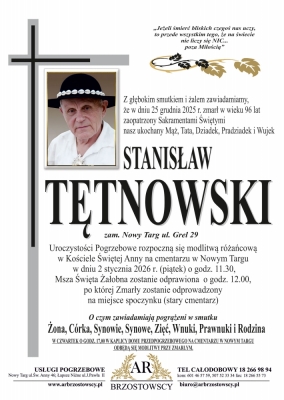 Podhale24.pl zastrzega sobie prawo do nie publikowania wspomnień, w szczególności tych nie związanych z profilem działu nekrologi, zawierających wulgaryzmy, wzywających do zachowań niezgodnych z prawem, obrażających osoby publiczne i prywatne, obrażających inne narodowości, rasy, religie itd, oraz te, bez możliwości telefonicznej lub mailowej weryfikacji ich autora.