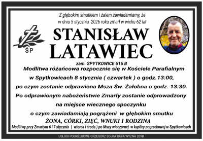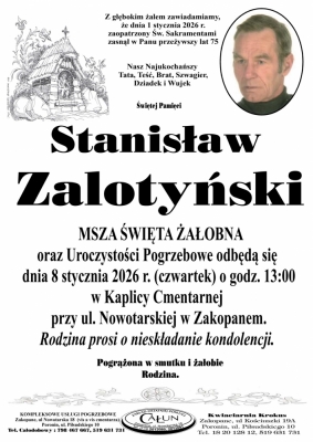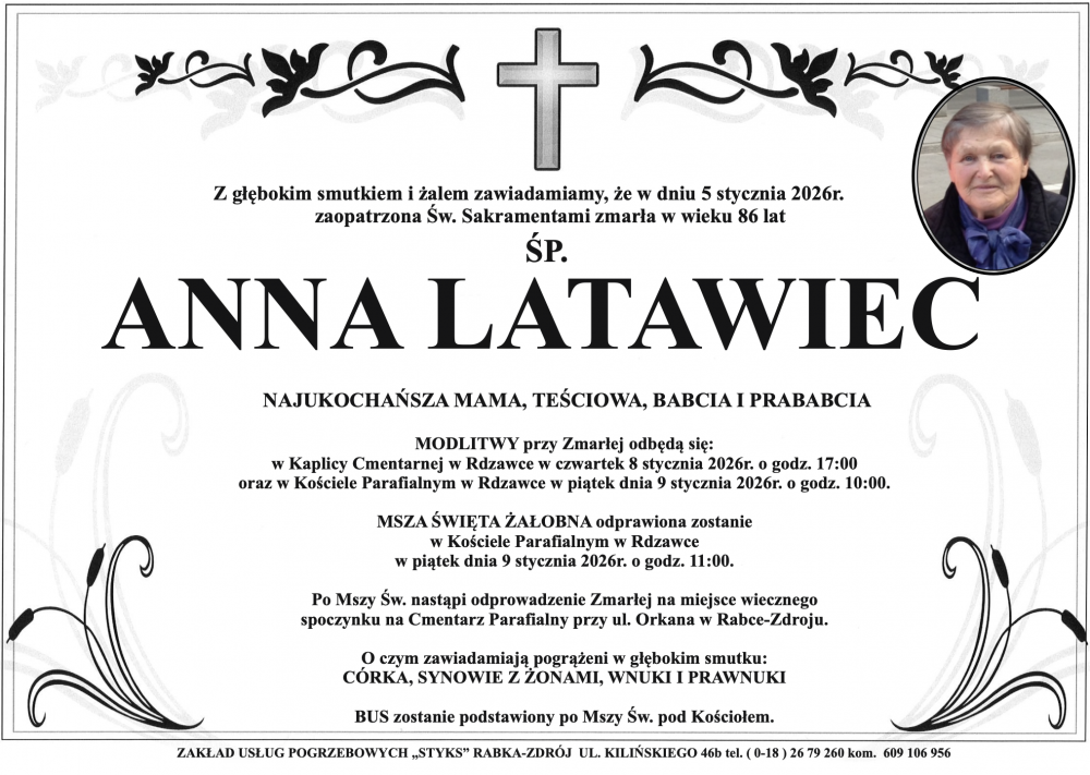Podhale24.pl zastrzega sobie prawo do nie publikowania wspomnień, w szczególności tych nie związanych z profilem działu nekrologi, zawierających wulgaryzmy, wzywających do zachowań niezgodnych z prawem, obrażających osoby publiczne i prywatne, obrażających inne narodowości, rasy, religie itd, oraz te, bez możliwości telefonicznej lub mailowej weryfikacji ich autora.